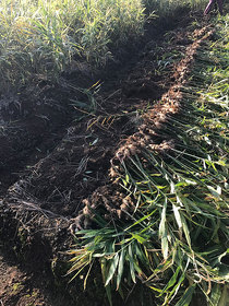 茎を引き抜くと生姜が姿を現します。後の作業がしやすいように綺麗に並べるのがプロのコツです。